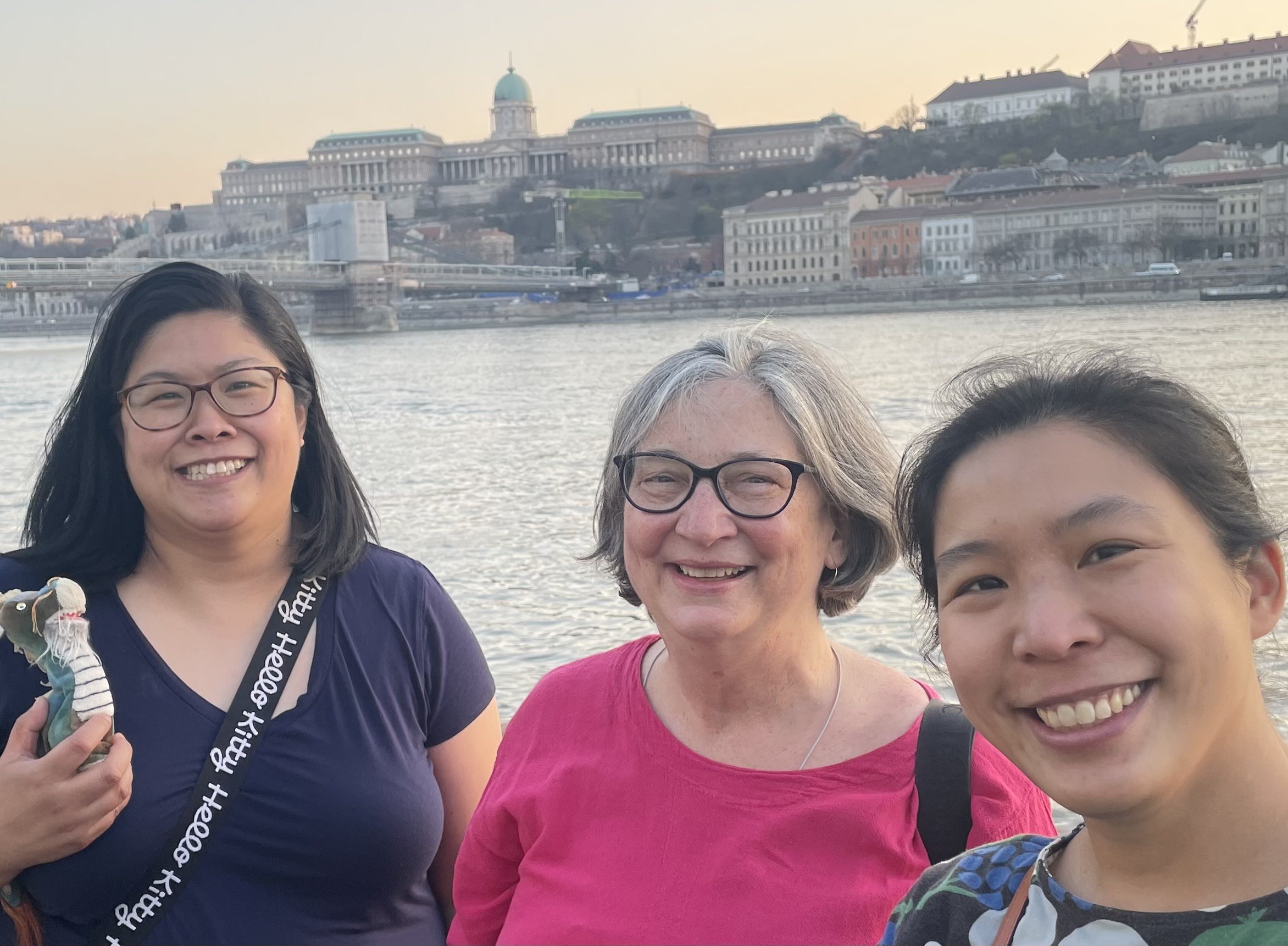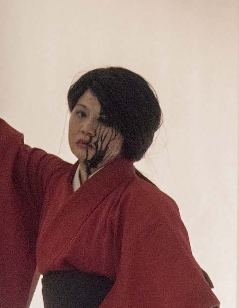 wears her fashion garment fabricated with tags from her immigrant parents’ dry cleaner.